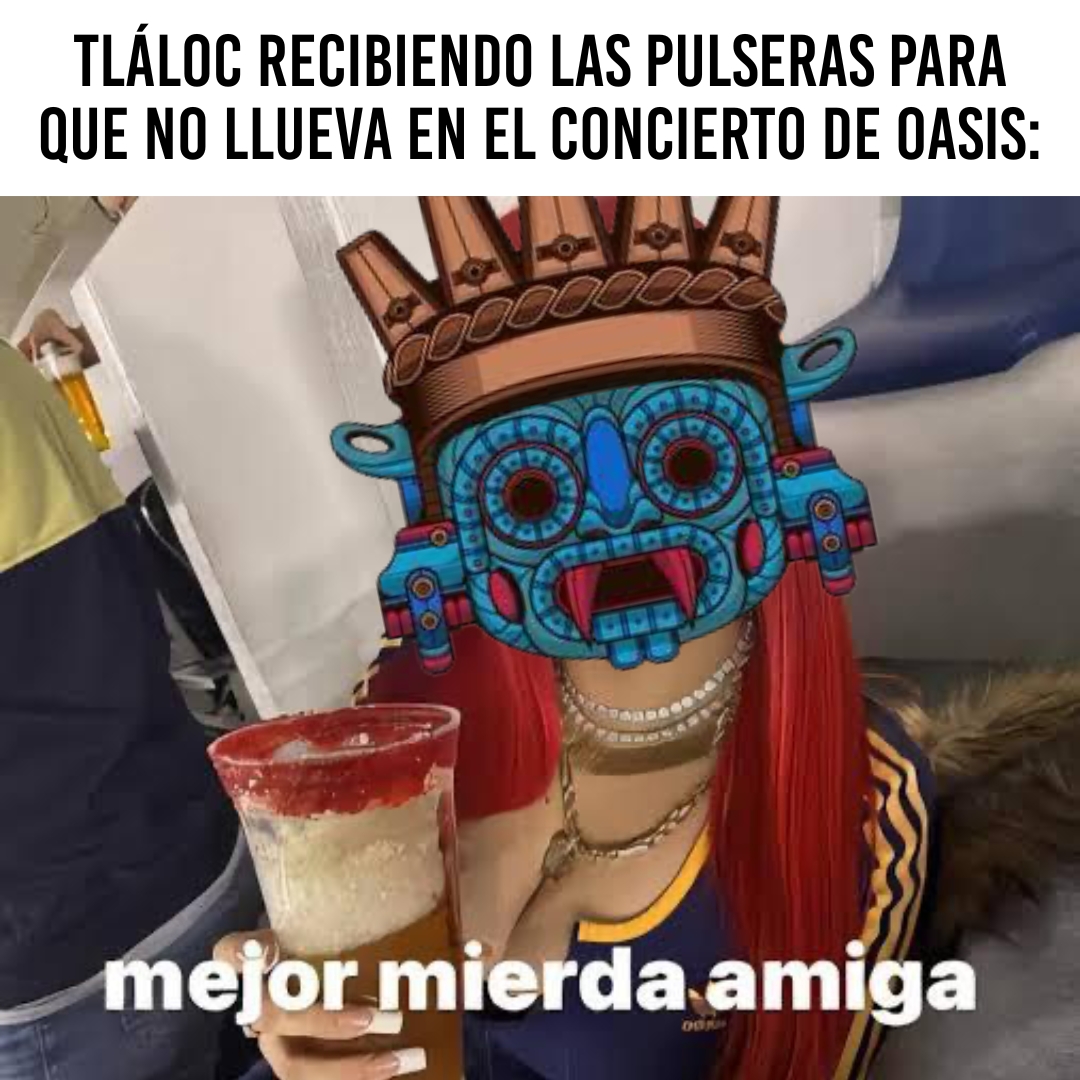 Por supuesto que la deidad debe estar agradecida por todas esas pulseras chamagosas y manzanas quemadas que está recibiendo en su monolito, pero muchos no están seguros si el Dios de la lluvia también puede impedir que lluevan chingadazos en el camerino de los hermanos Gallagher. Esperemos los asistentes se tomen doble Riopan en caso de terminar haciendo corajes. No vaya a ser que el concierto termine en desconcierto.