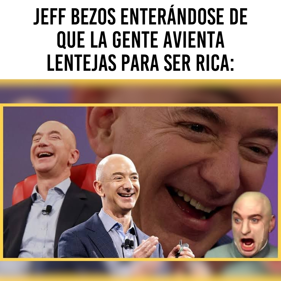 El pelón Bezos, conocido vulgarmente como “el pelón Bezas”, explicó que su envidiable situación financiera es producto de su esfuerzo, de su resiliencia, y de saber transformar momentos de crisis en oportunidades. Ni quién le crea, todos sabemos que es por todo lo que se ahorra no comprando shampoo.