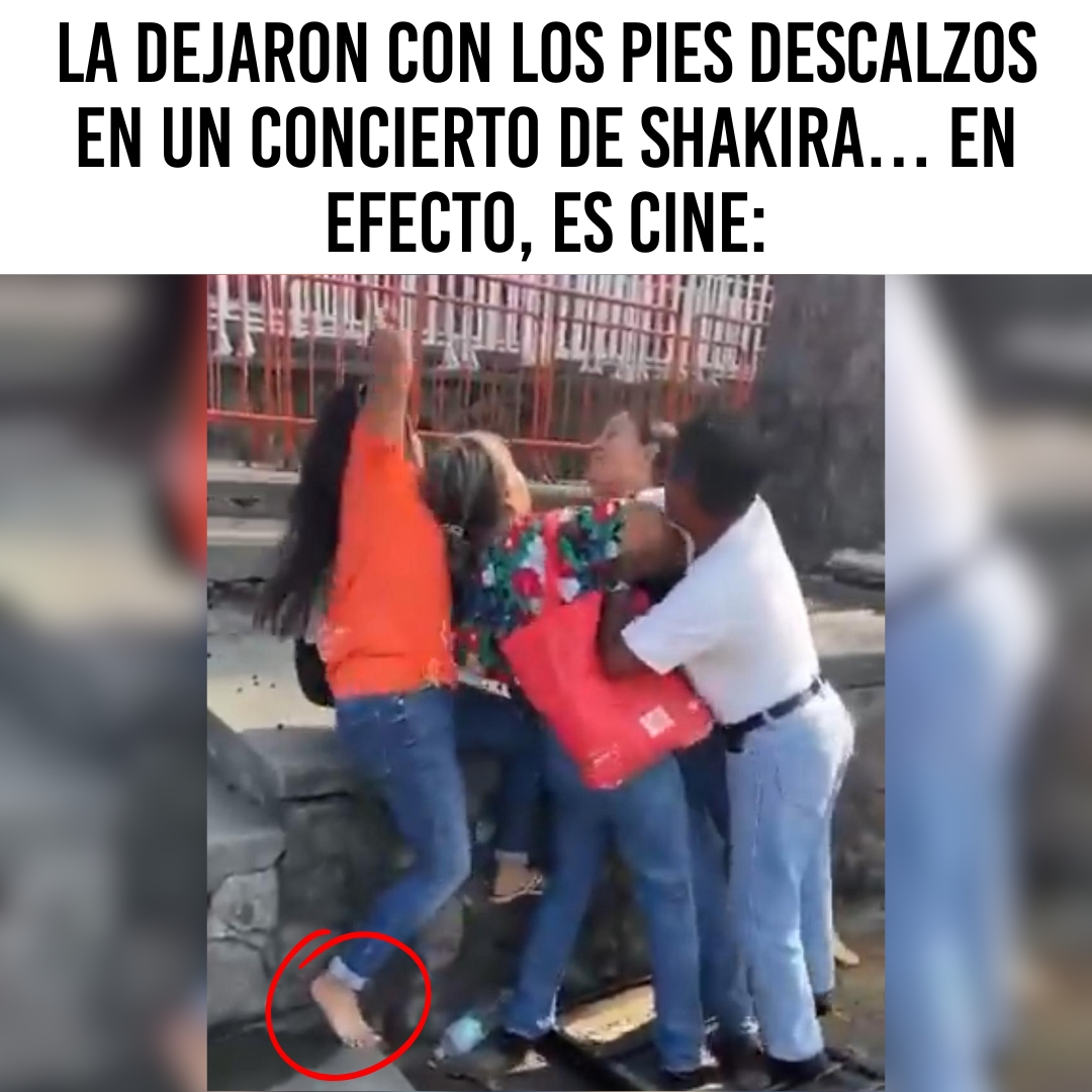 Después de recetarse unos cuantos «tsamina mina zangalegua» y arrancarse la peluca morada a coscorrones, una mujer, su hija y otra señora tuvieron que ser separadas por un señor que se encontraba vendiendo merch 100% original en el lugar. Cuando dicen que las viejas de Shakira pegan fuerte, uno pensaría que se refieren a las canciones y no a las fans.